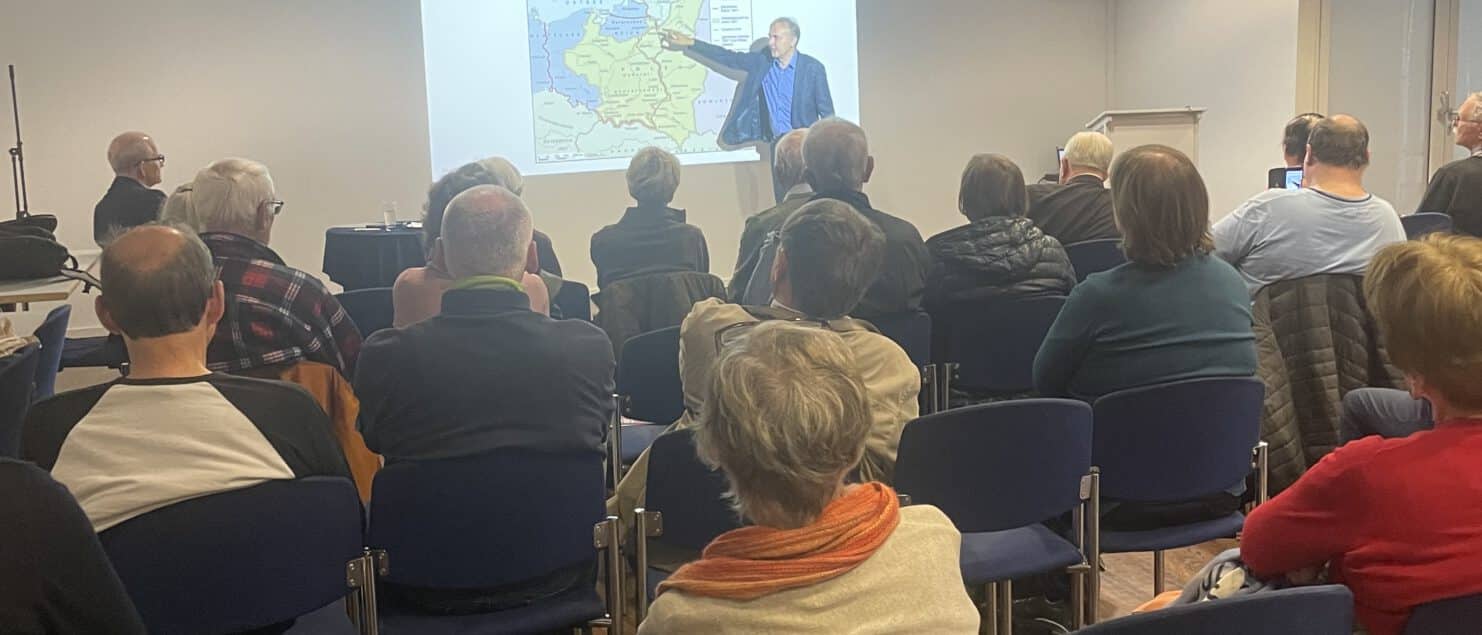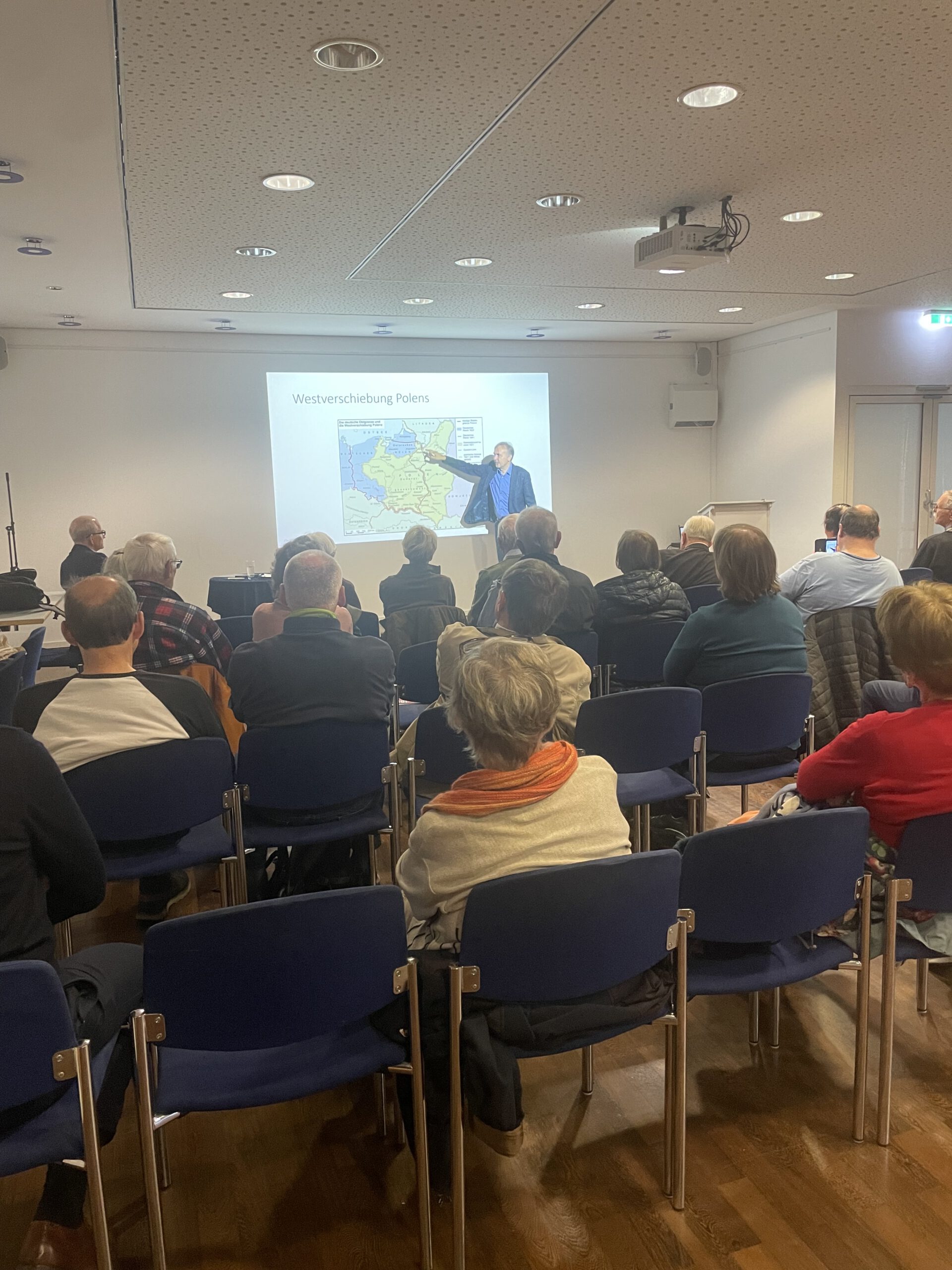 Viele interessierte Teilnehmer folgten dem Vortrag von Prof. Dr. Manfred Kittel über die Potsdamer Konferenz 1945 und die Vertreibung der Deutschen. Prof. Winfried Halder begrüßte die Gäste und den Referenten, während Dr. Bärbel Beutner ein Grußwort für den BdV Landesverband NRW sprach. Im Anschluss diskutierten die Teilnehmer rege mit Prof. Kittel. Dieser kündigte an, das Thema beim kommenden Vortrag 2026 weiterzuführen.